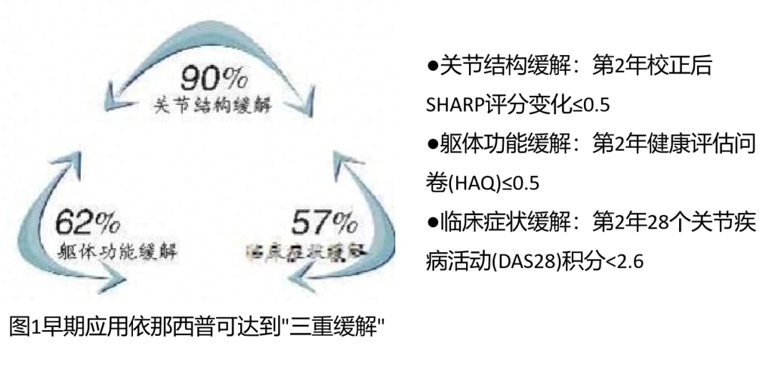 目前, 我国有AS及RA两种疾病患者近千万。但AS及RA治疗慢、难康复和高致残率的情况,给患者及其家庭、社会带来了沉重的负担。研究显示,早期应用依那西普可达到如图1所示的三重缓解。