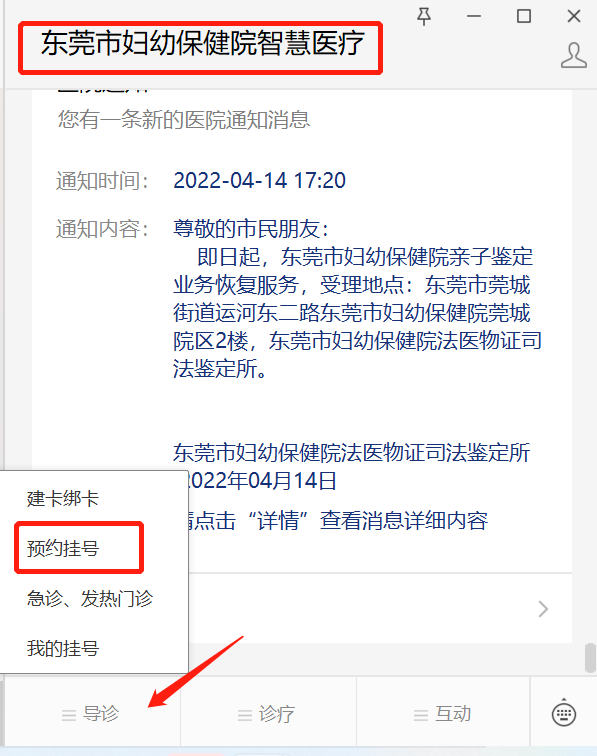 第一步,关注东莞市妇幼保健院智慧医疗公众号-底部菜单栏“导诊”-预约挂号