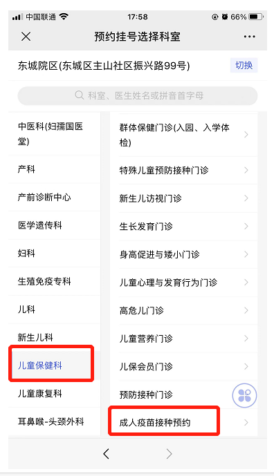 第二步,选择东城院区-儿童保健科-成人疫苗接种预约。