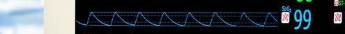 第一张图中的第四行黄色部分,包括两部分,前面的波形和后面的数字。正常成年人的呼吸频率为12-20次/分,安静时呼吸频率和幅度规整,吸气一次和呼气一次称为一次呼吸。通过电极、导线可以监测出呼吸频率的快慢,不过这一条监护的用处相对比较小,因为如果一个患者呼吸频率加快或者明显减慢的话非常容易被肉眼察觉到,就像我们刚跑完步一样呼吸很快一眼就能看出来。