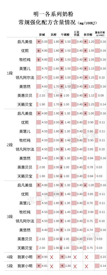 ③明一各系列全段的牛磺酸含量较多,10款奶粉的核苷酸含量较多,7款奶粉的胆碱含量较多,得到加分(标注为+)