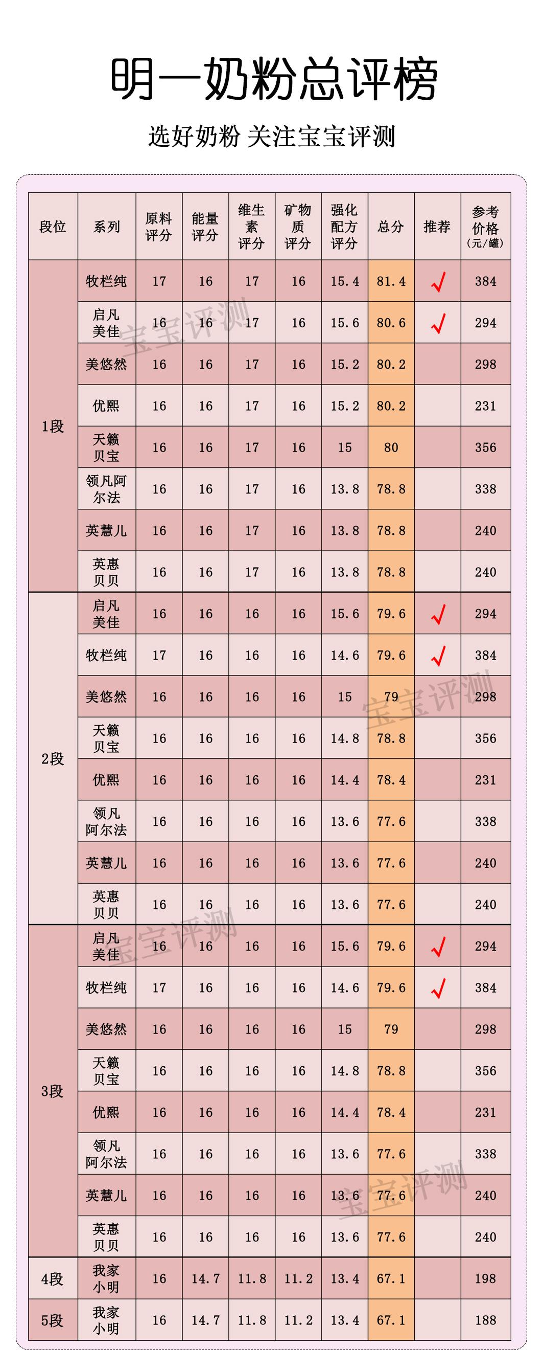 根据以上分析,笨爸爸综合了奶源地、奶基原料、基础营养和强化配方等指标,对明一各系列奶粉进行了细致的打分(满分100分)。具体得分情况如下图:
