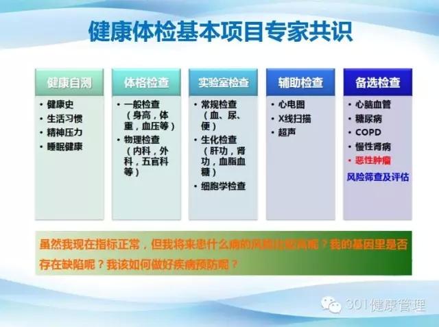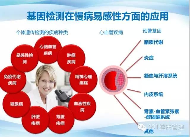 解放军总医院健康管理研究院开展疾病易感基因检测,通过对肿瘤、心脑血管疾病、代谢性疾病、消化系统疾病、呼吸系统疾病、自身免疫性疾病等13大类150种(男性64项、女性67项)慢性疾病易感基因进行检测,对患病风险进行评估和预警,并制定精准的个性化健康管理方案,指导疾病预防和治疗。