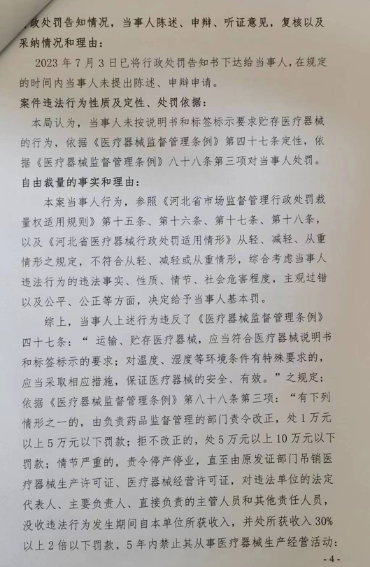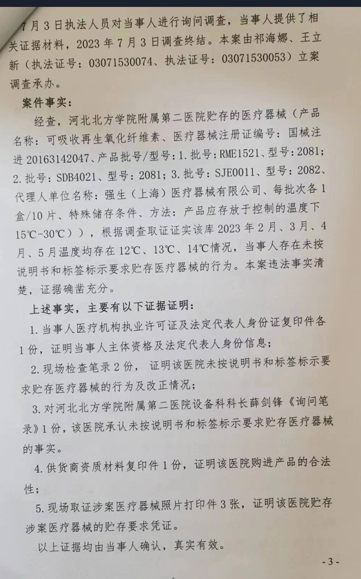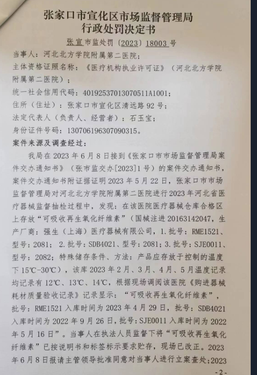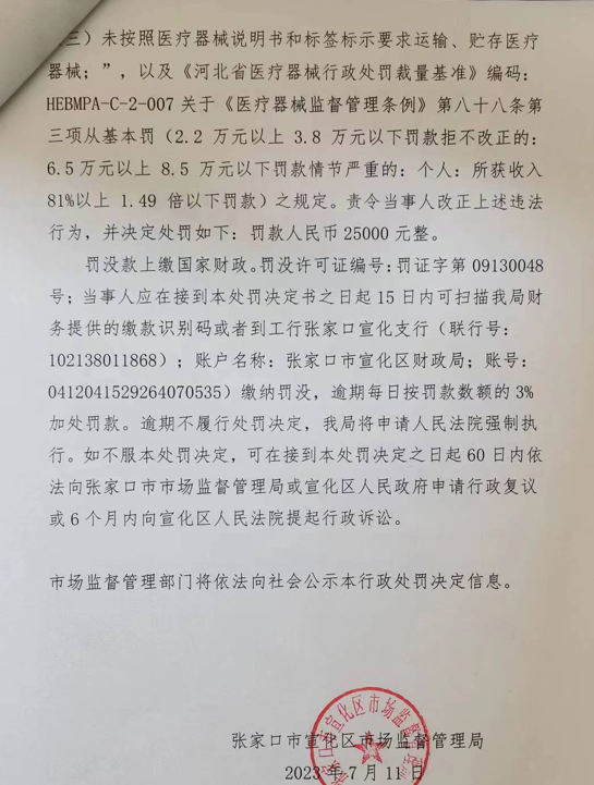 未按要求贮存医疗器械,河北北方学院附属第二医院被罚2.5万 2023-12-04 寻医问药 18297 作者:贝莱孕育 张家口市宣化区人民政府网站19日发布行政处罚信息,河北北方学院附属第二医院未按说明书和标签标示要求贮存医疗器械被罚款2.5万元。行政处罚决定书如下: