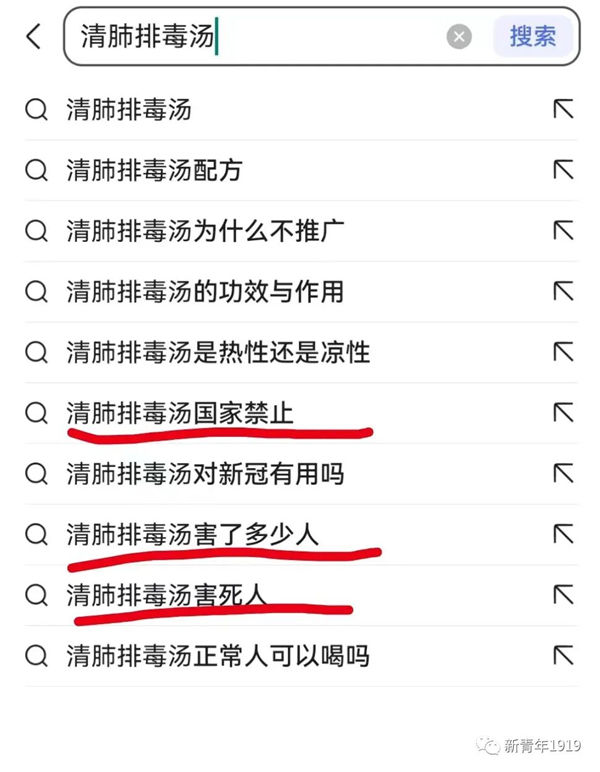 诸君,这样一个被国家列入“三药三方”,救人无数的“清肺排毒汤”,一副疗程仅100元左右的“清肺排毒汤”,百度给出的第一条关联消息不是别的,竟然是: