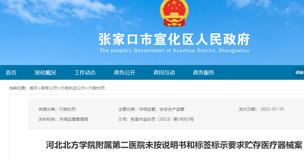 未按要求贮存医疗器械,河北北方学院附属第二医院被罚2.5万